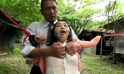 Vagina and ass fisting and fucking tied in the woods