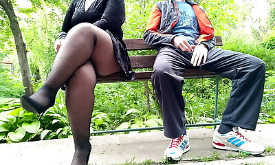 Unfamiliar Cougar in pantyhose jerked off my boner in the park on a bench